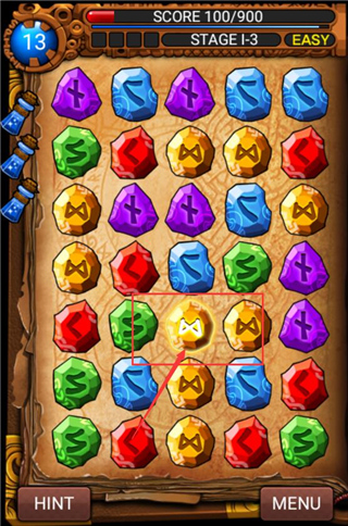 区别于以往的 “三消” 游戏,RuneMaster Puzzle 是四连消除。将同色的符文连成四个(或以上),横列竖列斜列都可,就会听到具有很强听觉冲击力的 “啪啪” 符文破碎声!笑~游戏采用 “精神力” 这一游戏机制,符文每一次的移动都需要消耗其值,所以我们需要在值限内尽可能多的获取高分通过此关卡。