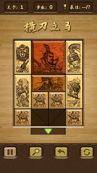 6、再次进行关卡挑战,就是人名显示啦,让红色“曹操”滑到底部绿色出口,即可过关,底部几个功能分别是暂停、查看提示、撤回上一步以及重新开始。