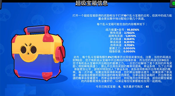 宝箱分为乱斗宝箱、大型宝箱和超级宝箱三种。荒野乱斗腾讯版的宝箱刷新频率比较高,3倍以上的宝箱就已经非常值得购买了,倍数越高代表礼包的东西越多,性价比也就越高。宝箱有几率开出金币、战斗能量、稀有英雄、超稀有英雄、史诗英雄、神话英雄、传奇英雄、星徽之力和随身妙具等等。不同的物品开出概率不同,在不同宝箱中概率也会有所变化。