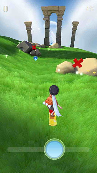 简单模式:固定增加会造成死亡障碍物的红色“X”提醒;常驻蓝色的操作按钮滑块,松手会出现最佳控制区域,过几秒就会隐藏。