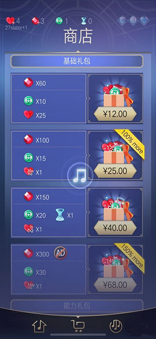 被气泡包裹着的音符与点击气泡音符后的弹窗提示,若此时直接关闭该弹窗,则只会获得一颗红宝石;若观看广告,在观看完广告后会获得相应的红宝石数量翻倍。