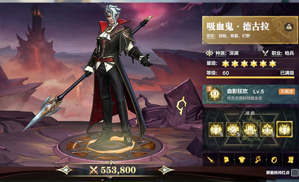 介绍完适合打野的两个新手统帅后,这里着重推荐一个非常优秀的打野统帅——德古拉。这是游戏中目前最强的打野统帅。同时,德古拉的培养也很简单,可以通过「德古拉的试炼」获得,活动在开服第三天开启。并且活动并非一次性的,后续还会再次开启,可以从中获得大量德古拉的星盘、经验书等奖励。虽然德古拉对魔兽的伤害加成没有两个新手统帅多,但千年智慧技能额外获得的经验是目前游戏中最高的,此技能满级后其所在部队的统帅在战斗中额外获得70%经验值,携带他的部队可以获得更多的经验,升级so easy!德古拉不仅主动技能可以回血,在击败其他部队时也能回复大量生命值。强大的续航能力足以让你在打野时不需要在城池和地图上来回穿梭,可以进行长时间作战。不仅如此,当部队生命值较低时还可以利用技能不死之身,通过在野外击杀较为弱小的魔兽从而补充生命值,使部队生命可以始终维持一个健康的水平。