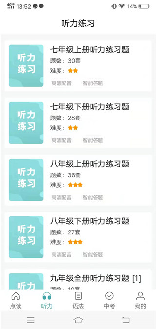包含七、八、九年级的听力训练,配有高清发音,并且听力内容与教材紧密结合、由简到难。