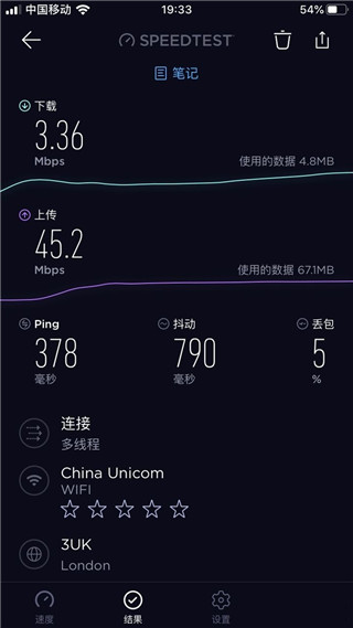 2、测试结果主要为3项:Ping 值,下载速度和上传速度;