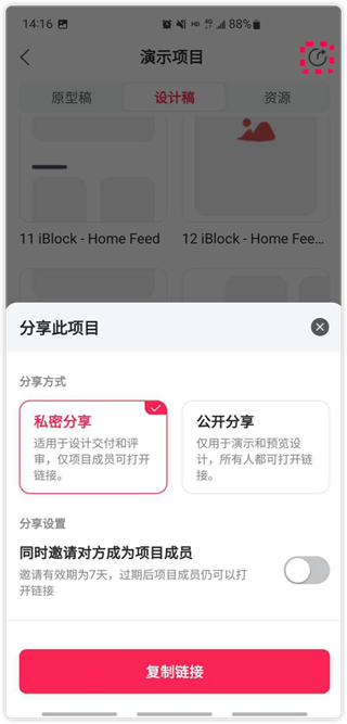 8、在项目首页右上角,点击“分享图标”,可以直接复制链接,发送给其他小伙伴在线预览。