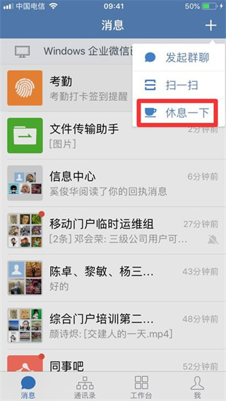 启用时,只需要在消息界面点击右上角“+”,点击“休息一下”,