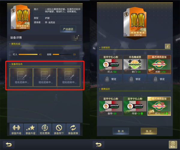 号码调整妥当后,其他装备的提升也不能落下!在艾特足球手游新版本中,装备冠名系统惊喜开启。点击装备就可以看到冠名系统的入口,你可以消耗一定的欧元和精华之证对冠名进行刷新,从中选择符合你需求的冠名。消耗量会随着次数的增加而增加,新的一天会重置为初始状态。