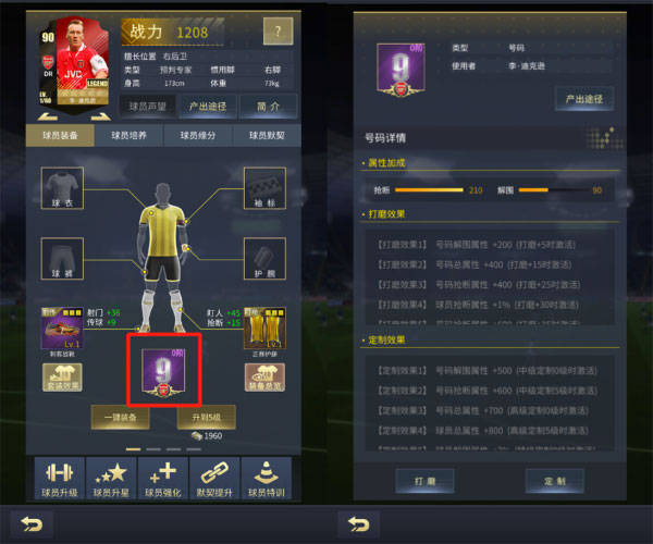 在艾特足球手游中,当你为球员选择了专属号码后,除重生外你将不能对号码做出改变,所以选择时要慎重考虑。号码选择完毕就可以对它进行打磨与定制,从而提升它为你带来的属性收益。