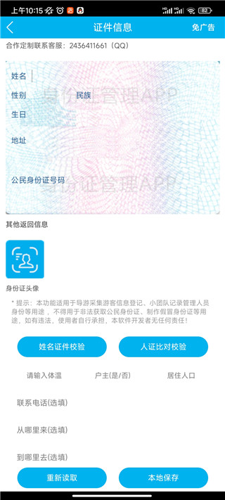 身份证管理app是一款能够帮助用户轻松查询验证身份信息的强大应用,通过它用户完全不用再担心身份信息的管理问题,不仅能够帮助你管理身份证件、查询身份信息,更可以提高你的工作效率。同时,软件还支持管理银行卡账户信息,用户可以随时进行信息的采集,并且用户在遇到任务问题时,还可以随时提交问题,工作人员会及时给予详细回答,非常的方便实用。不仅如此,在身份证管理app中用户还可以使用OCR技术对证件进行单张、批量识别,获取证件文字信息,并支持保存到本地excel表格,支持一键导出。此外,身份证管理系统最新版中拥有各种识别excel本地文件,支持用邮件方式、微信分享方式、qq分享方式、发送到我的电脑方式、蓝牙等方式将证件信息excel发出,为你省心有省力,是你的身份证管理好助手,需要的小伙伴快来下载使用吧。身份证管理系统最新版本特色