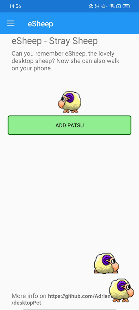电子绵羊esheep是一款复刻了Windows 95 时代16/32位程序STRAY SHEEP的开源软件。最早的STRAY SHEEP是一个 16 位 Windows 程序,只能运行在 Windows 95 以前的设备上。其来源是日本动画师野村达俊 1994 年制作的“流浪绵羊”系列五分钟动画短片,该短片在日本富士电视台播出。eSheep复刻了这一功能,并扩展了许多形象,还带有不同动画效果与音效。 电子绵羊esheep的绵羊会四处游荡,奔跑,打喷嚏,吃花,在空中跳跃,在窗户上爬来爬去,倒立,弹跳,并且支持多只羊在屏幕上。小编这里为大家推荐电子绵羊esheep安卓版下载,使用非常简单,用户安装后,只需要点击一次,就可以显示宠物羊了,是一款不可多得的桌面宠物软件。