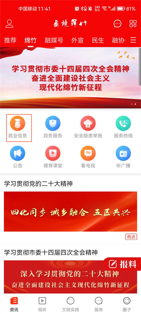 1、双击打开画境绵竹app,在资讯界面找到就业信息按钮;