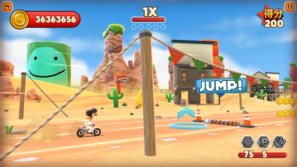 5、我们只需要控制摩托车通过跳跃或车手微蹲来躲避障碍和陷阱,同时收集途中的金币以及道具等物品,完成每个赛道的任务到达终点即可。