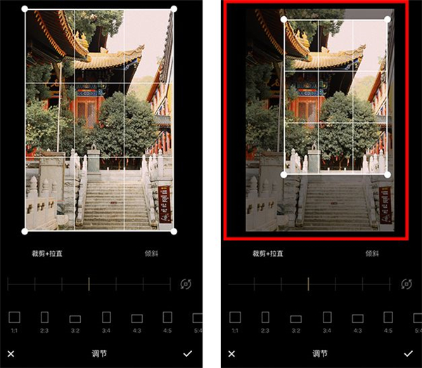 原图边角不是一条直线,画面有些畸变。通过裁剪工具里面的倾斜工具来调整使画面横平竖直。