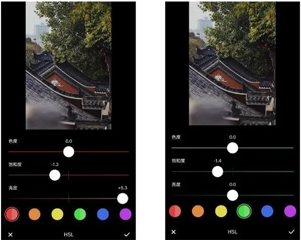 HSL:6种颜色,每种有色度,饱和度,亮度,可单独调整画面中某一人颜色,不改变整体。