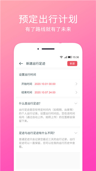 3、可以新建出行足迹,设置出行时间,您在该时间段内,通过自动上传,拍照上传的位置都会保留下来