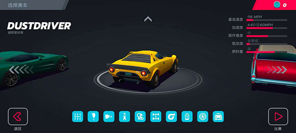 在一开始游戏的时候,我们只有一辆车可以控制,不过慢慢的随着比赛的完成,车辆可以进行解锁(以及购买)车辆的右上角会有车辆的一个性能的信息,可以进行查看