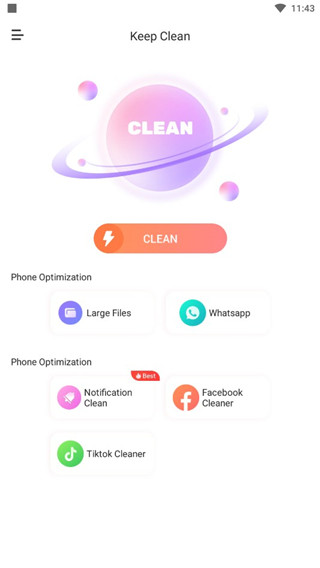 1、下载好app,点击进入,软件以极简画风设置,直接点击【CLEAN】即可开始扫描手机垃圾。