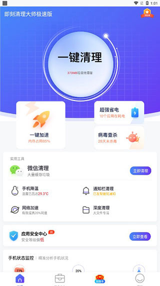 1、一键清理缓存、安装包、垃圾文件等一键清理。