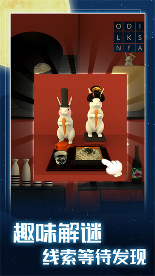 月夜逃出计划是一款以日本传说为背景,精致可爱的解谜游戏。游戏讲述了传说中的竹取公主为了躲避皇帝的求婚让月兔们把她藏在了一间和室里,找到公主的人就可以带她逃出去啦。玩家你在这间和室醒来,看似简单朴素的房间实则大有玄机,隐藏在图案后的谜题,需要触发机关和密码才能开启的家具,还有掌握着通往公主房间关键道具的月兔们,想要带走公主,就开动脑筋从月兔手里拿到关键道具,解开房间里所有的迷题。并且小编在下面的内容中也给出了游戏通关攻略,小伙伴们也可以看看哦。总之,月夜逃出计划手游有着美丽的传说,精美的画面,和风的音乐,通关之后还可以继续与月兔们捉迷藏,有感兴趣的玩家就快来下载试试吧!