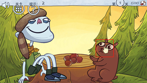 点击小松鼠让它吃榛子,然后再点击角色也让他吃一个榛子,最后2个榛子都让角色吃掉即可通关。