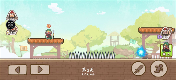 2、玩家可以通过左下角的反向按钮进行移动,点击小刀按钮进行攻击,小人按钮进行跳跃;