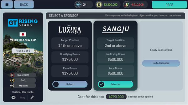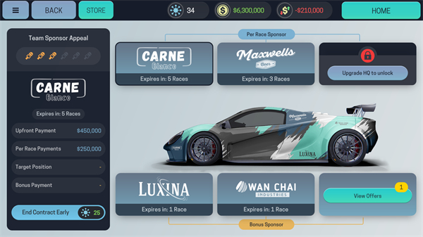 赞助是车队除去赛季末奖金以外,最主要的收入。一个表现好的车队,更容易拿到声誉更好的优质赞助,车手的言行可能也会影响赞助商的偏好。
