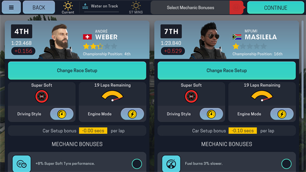 排位赛有时间限制,一般来说能跑个两三次,在这期间,玩家要做的事给车手设定好合适的轮胎与驾驶风格,让车手能跑出自己的最好成绩,并把这个调整好的设定带入正赛。