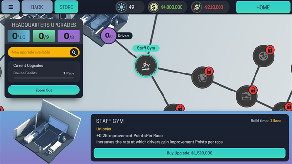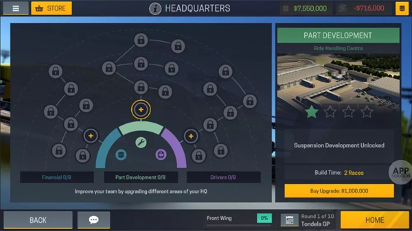 总部升级也是一个不可忽略的部分。在每个赛季开始时,会有一些多余的钱,从我个人角度,我会尽可能地把这个钱拿去升级。总部的升级分为经济、模块制造、车手三方面,按需升级即可。