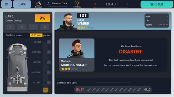车手是另一个非常重要的变量,并且可经营度不亚于车辆。玩家作为经理,要能根据车手的期望提供双方认可的合约。签下之后,车手的表现也会为他自己挣下技能点升级,一共六项指标,都是越高越好。