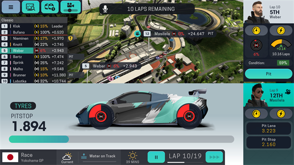 正赛不仅比的是车手的水平,车的水平,经理的组织安排也非常重要。在一场比赛中,玩家必须要计划好两部车进站换胎的时机、更换的胎型等等。一场计划得好的比赛,才是一场发挥出真正水平的比赛。