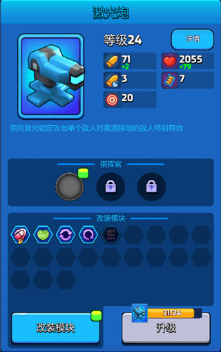 理由:从输出上来看激光炮是不及格的,但他的专属指挥官效果很好,直接是一个小控制,玩游戏的都知道控制效果有多重要。而且对付乌鸦(主线的速度奇快的小飞机)时也很能体现其效果。
