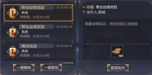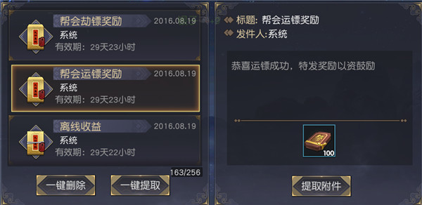 1、帮会运镖:护送时间内,成功将镖车送达目的地,则运镖成功,运镖帮会可以获得10000点帮会资金,参与运镖帮众可以获得100点帮会贡献,帮众个人奖励将以邮件形式发放