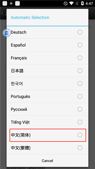 3、拉到下面,选择“中文(简体)”即可。软件需要清除后台进程,重新运行即为中文版。