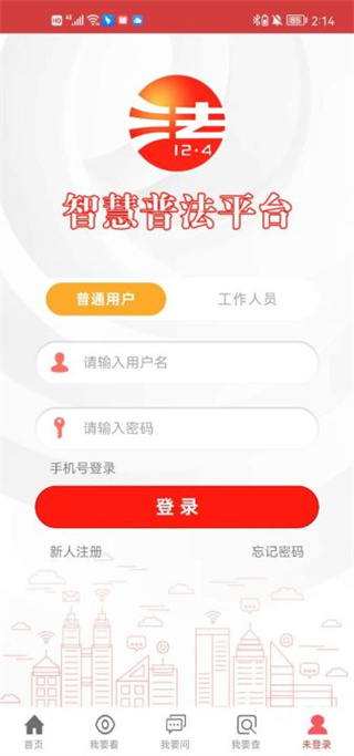 1、首先我们进入智慧普法平台app当中,没有账号的朋友需要进行注册,点击“新人注册”;
