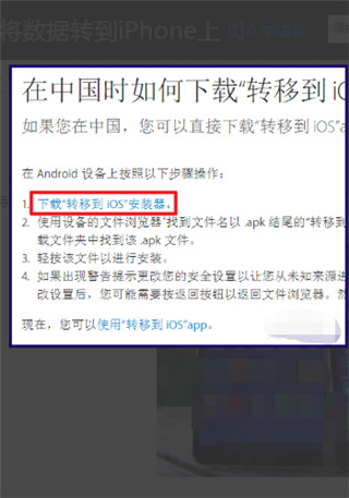 3、软件需要安卓4.0以上的版本才能使用进入苹果官网,下载【转移到iOS】,安版装到安卓手机上。