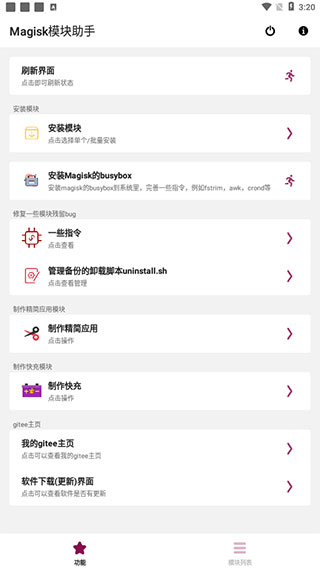 一、安装模块1、从本站下载软件安装包,安装后进入Magisk模块助手,选择“安装模块”