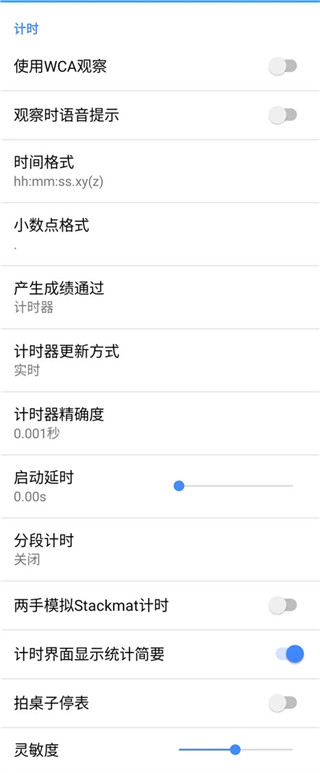 第一个设置是“使用WCA观察”,这个默认是不打开的,如果打开则会先有15秒的观察时间,以此决定成绩,更加模拟WCA比赛,如果不打开就会直接开始计时