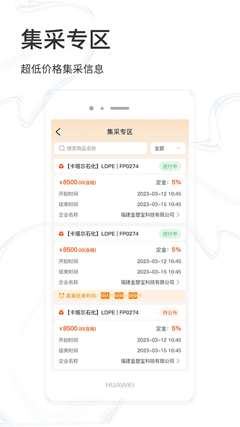 - 原料市场:创新提出塑化全产业链(B2BTC)垂直延申模式,提供全球化交易服务,覆盖PVC、PP、PA66、PE等塑化领域原料及产品。