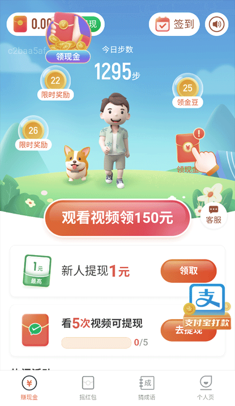 2、然后我们可以在首页完成相关任务获取现金豆,每天的步数也会显示在这里;