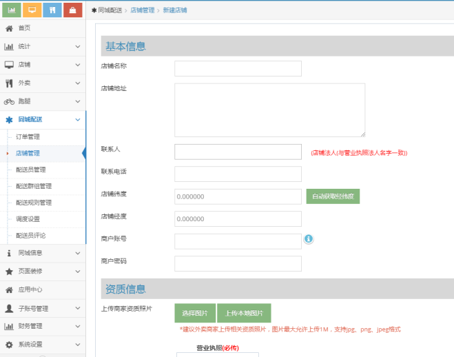 1、购买同城配送功能,总账号后台新建同城店铺。