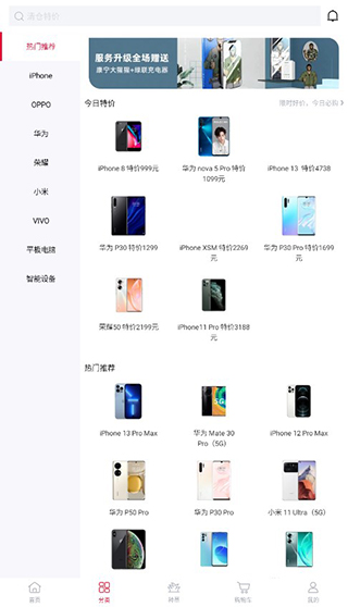 用户点击下方分类,即可进入手机分类页面,可以查看iPhone、oppo、华为等手机分类,也可以查看热门推荐内容,还可以点击上方搜索框,搜索自己想要购买或查看的手机型号。