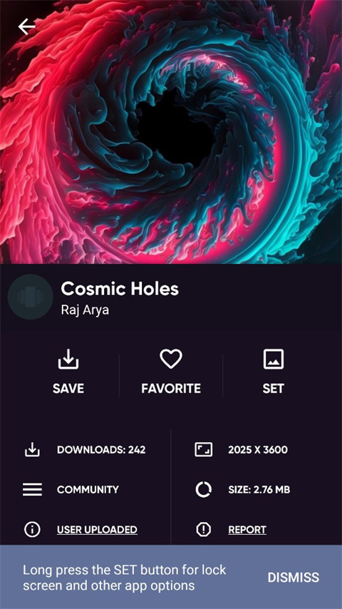 Backdrops壁纸app当中的每一款壁纸大家都可以看到具体的下载数量、尺寸、以及收藏和设置按钮,而且大家不仅可以收藏别人的壁纸,也可以自己上传自己的摄影作品,团队会在后台进行筛选,将优秀的作品放在社群页,供用户下载使用。总体来说,Backdrops这款软件内的壁纸虽然没有那些大厂商的多,但大部分壁纸风格都是质感风格,却又和一般的质感风不一样,简单却又不失细节,很适合拿来做壁纸,喜欢的朋友可以下载试试哦!