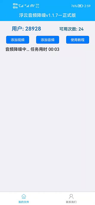 1、打开浮云音频降噪软件官方手机版,点击添加音频按钮,进行音频选择;