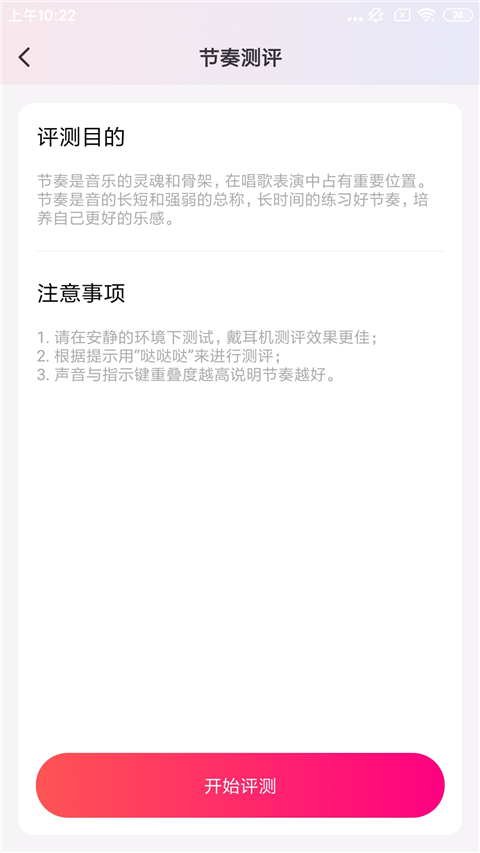 3、这里点击的是节奏测评,你可以了解一些评测的目的以及注意事项。