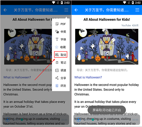 3、按住屏幕选择文章内容,然后查看英语的发音还有含义。软件功能