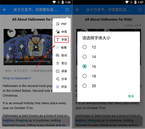 1、下载安装好英语头条极速版app最新版,点击右上方选项可更改字体大小,通过字体设置功能可以自由修改调整字体大小;