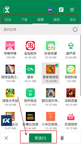 4、在Xender应用程序中,选择要传输的文件,例如照片、视频、音乐、应用程序和文档等