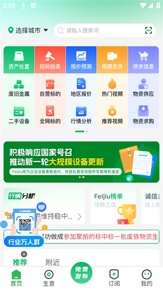 Feijiu网App是中废通旗下的B2B废旧物资交易平台,它秉持 “让废旧生意交易更轻松”的理念,为企业、加工厂和个人服务!废旧网App不仅提供行情参考与决策依据,更有免费信息发布、供求查询等多种功能,加上信息对接、在线交易、资产拍卖、品牌宣传等综合服务,可为用户实时推送最权威的废旧行情报价及资讯!
