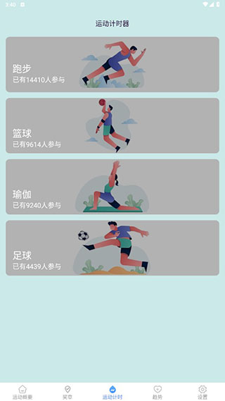 4、点击屏幕下方运动计时按钮,在这个页面可以进行跑步、篮球、瑜伽、足球这四个运动的计时,并且都会记录下来。