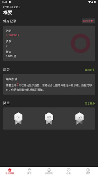 2、点击屏幕下方运动概要按钮,即可快捷查看健身记录、运动趋势、奖章。